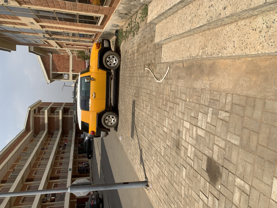 This image displays a daytime urban street scene in Abuja, Nigeria. The foreground features a herringbone-patterned concrete block pavement. A grey utility pole stands in the left foreground, with small debris at its base. To the right of the pavement, three concrete steps ascend towards a multi-story building characterized by a red brick facade and tall, dark-framed windows. A narrow strip of exposed dirt with sparse vegetation runs between the pavement and this building's foundation. A white, flexible pipe lies coiled on the paved ground near the steps. In the midground, a yellow and white two-door Toyota FJ Cruiser SUV, equipped with a black roof rack, is parked facing right. It is positioned adjacent to the red-brick building on the right, with its wheels on the paved surface. The background to the left reveals a large, multi-story building constructed with red bricks and featuring multiple balconies with white railings on at least five visible floors. Several ground-floor doorways are open. Indistinct human figures are discernible on the balconies and at the ground level of this building. A paved asphalt road runs between the foreground pavement and this structure, where two dark-colored sedans are parked; one is partially obscured by the utility pole. Another multi-story building is partially visible in the distant background. The sky is clear and light blue, and strong shadows are cast, indicative of bright daylight conditions.