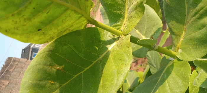 The image displays an outdoor, close-up view of a green-leafed plant in an urban or suburban environment within the city of Unknown, Unknown. The foreground features multiple large, ovate, vibrant green leaves and a central stem, all heavily coated with fine particulate matter consistent with dust or pollen. On the upper left leaf, a cluster of small, yellowish-orange insects, identified as probable aphids, is visible. Scattered tiny black specks, possibly additional insects or debris, are present across the leaf surfaces. In the background, to the upper left, a textured, light-colored masonry wall is partially visible, traversed by a thin, dark horizontal line. Behind the plant and wall, a building with a dark, sloped roof and distinct blue-framed windows is discernible against a clear, light blue sky. Strong, natural daylight illuminates the scene from the right, casting shadows and highlighting the texture and surface details of the leaves and background elements. No human subjects are present.