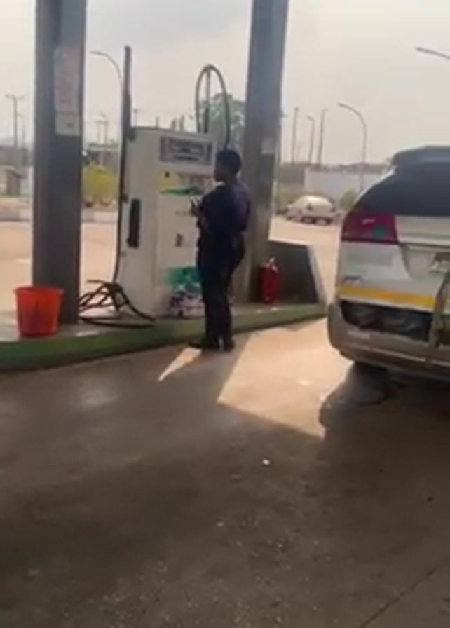 man standing next to a gas pump at a gas station. He is holding a phone and appears to be looking at it. A white minivan is parked next to the pump. Another man in blue pants stands behind the van, also looking at his phone. The gas station has a green and white color scheme. There is a fire extinguisher next to the gas pump. The ground is wet and shiny.