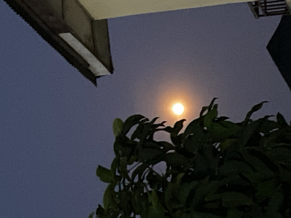The image depicts a nocturnal or crepuscular scene within a residential area of Lagos, Nigeria. A prominent, diffuse orange-yellow celestial body, consistent with the moon, is centered against a dark blue-grey sky. Dense, dark green foliage from a tree or large plant occupies the left vertical portion of the frame, partially obscuring the celestial object. In the upper right quadrant, the corner of a building is visible, featuring a dark, corrugated metal roof, a light-colored fascia board, and a segment of a beige or cream-colored wall. A second structure, identifiable by a dark, triangular roofline and a dark vertical railing, is partially discernible in the lower right portion of the image. No human subjects or active events are present.