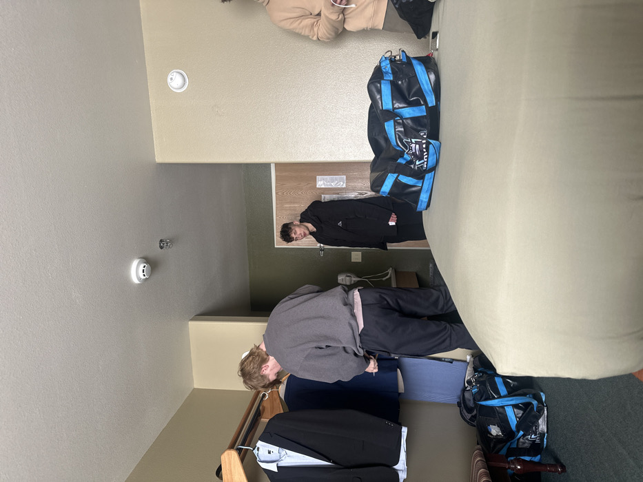 A hotel room is seen with two people. One individual wears a grey hoodie and dark pants and stands near a clothing rack with a suit. Another person in a black jacket stands in the doorway. Two blue and black duffel bags are positioned on the floor, one near the bed. The room features a beige wall, a white ceiling with smoke detectors, and a glimpse into the hallway.