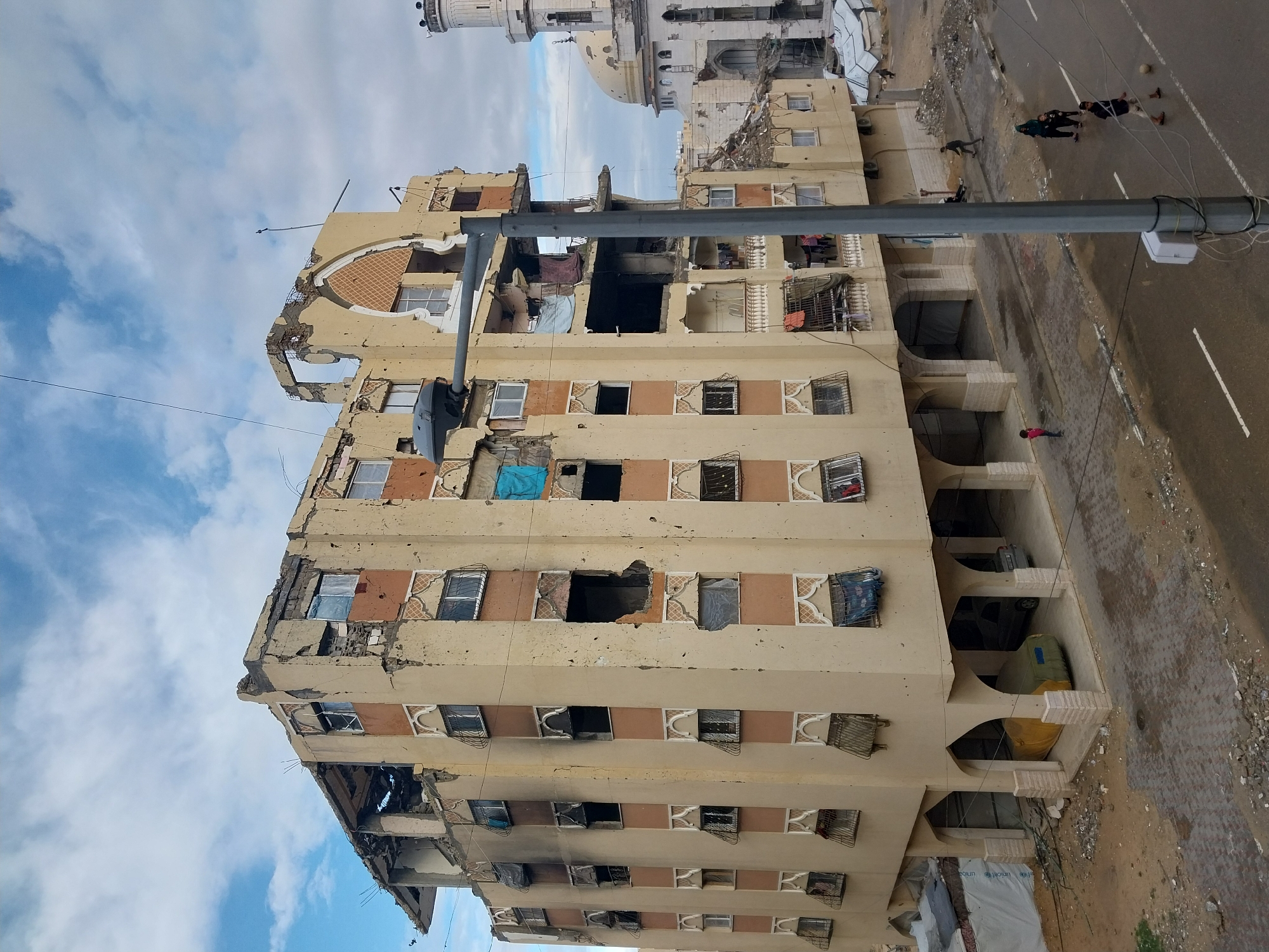 The image depicts a heavily damaged multi-story building in Khan Yunis, Palestinian Territory, under a partly cloudy sky. The building, predominantly light beige with brown vertical accents and white arched window details, exhibits extensive structural damage. The roof and upper floors are partially collapsed, exposing rebar and internal structures. Numerous windows are shattered or missing, with some showing charring from fire damage. The facade is marred by numerous impact marks. Makeshift coverings, including blue tarps and fabric, are visible in some window openings and on balconies where clothes are still hanging. At street level, the building features an open ground floor with arched supports, sheltering three parked cars, two of which are covered in yellow and green tarps. The adjacent street is asphalt with white lane markings, flanked by a debris-strewn sidewalk. To the left, white tent-like structures, one partially displaying "UNICEF," are erected near the building's base. In the mid-ground, a damaged mosque with a light-colored dome and a cylindrical minaret stands to the right of the primary building, surrounded by rubble from other destroyed structures. On the street, several individuals are present: a person in dark clothing walks on the sidewalk, a child in a red top stands near the curb, and a group of three (an adult with two children) walks further down. Another boy in a dark shirt and shorts is seen kicking a soccer ball on the road. A grey street lamp post with cables is prominently featured in the foreground, partially obscuring the view.