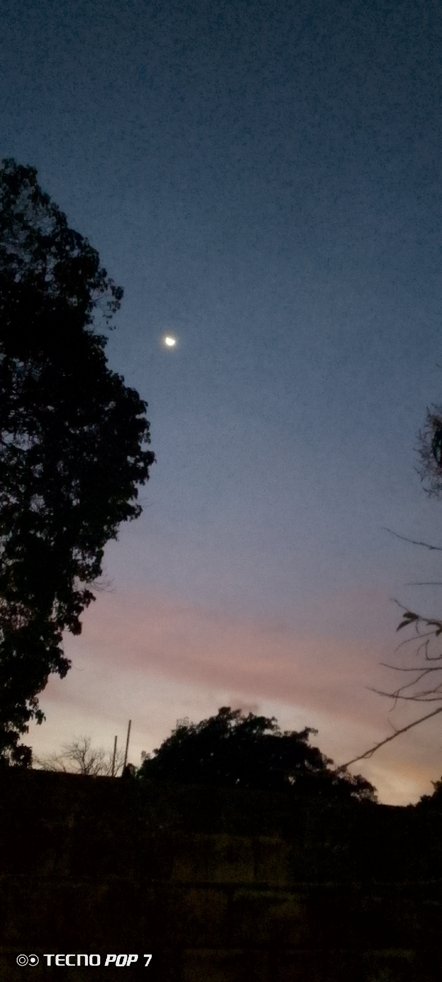 The image depicts a dusk or twilight scene, possibly in Altagracia, Venezuela. The sky transitions from a deep blue at the top to a pinkish-orange hue near the horizon. A crescent moon is visible in the upper part of the sky. Silhouetted trees and foliage frame the image on either side, and there appear to be other trees and vegetation further back, nearer the horizon. The foreground is dark, suggesting an elevated position looking down on the landscape. There are no visible people or animals. The image includes a watermark, which reads "TECNO POP 7" at the bottom.