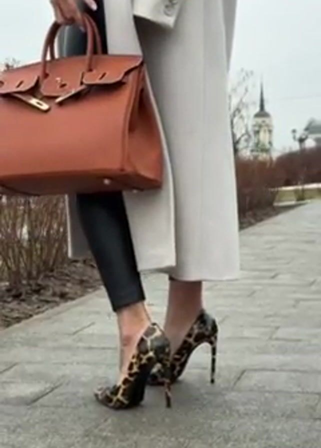 woman standing outside on a grey brick walkway in a park or city square. She is wearing black leather leggings, leopard print high heels, a white shirt or top, and a light grey overcoat. She is holding a brown handbag with gold hardware. The woman is adjusting sunglasses on her face. In the background, there are trees, a church or monument with a spire, and an overcast sky. The woman is the central focus and the camera moves slightly to follow her motion.