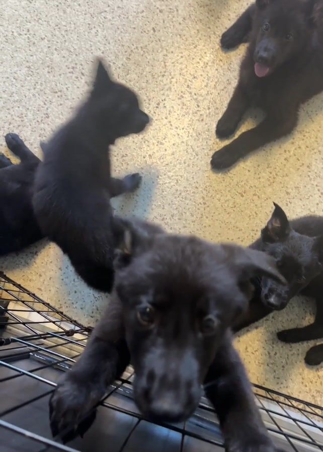 group of black puppies on a speckled tile floor. The puppies are in varying positions; some are lying down, one is standing, and one is trying to climb up a wire cage. The standing puppy faces the camera and wags its tail slightly. The light in the room is relatively dim.
