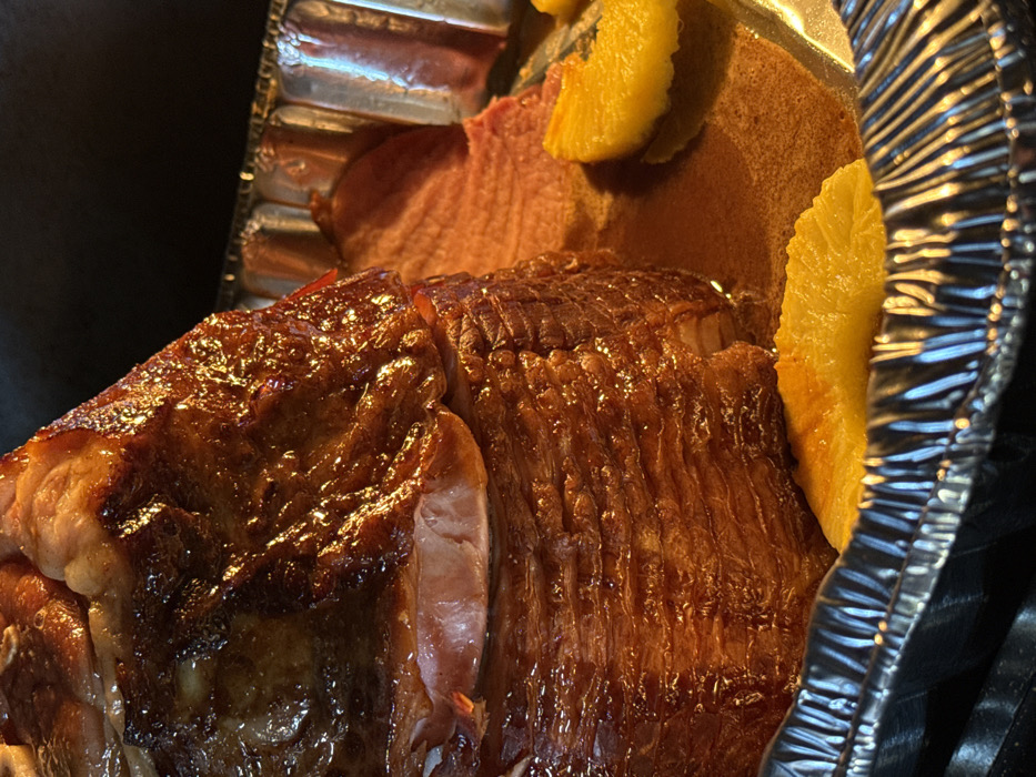 A close-up shows a glazed ham in a foil pan, partially sliced