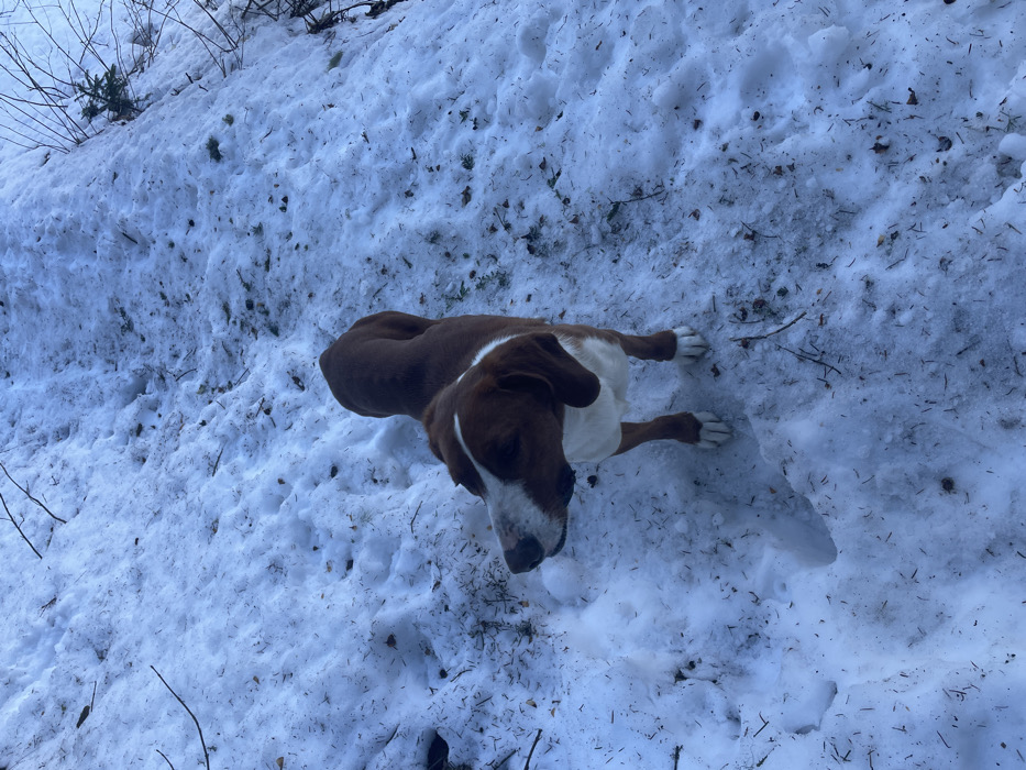 - "The image depicts a reddish-brown and white bi-color dog standing on a snow-covered upward slope or path in Pitomine, Montenegro" by FM-srcYD2, licensed under CC BY 4.0