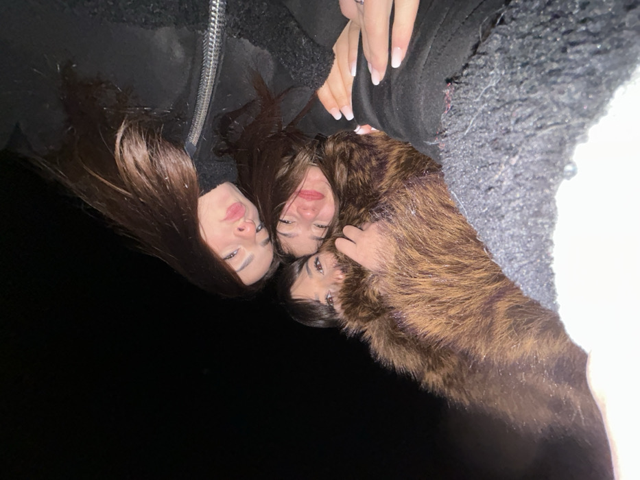 Three young women huddle closely together, faces illuminated against a dark backdrop. The woman on the left wears a black jacket and has long brown hair. The woman in the center also has brown hair and a slight smile. The woman on the right wears a brown fur jacket. Their hands are visible, indicating they are hugging. The background fades into darkness on the left and lightens slightly towards the right.