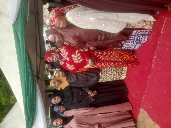 group of nine women standing in a line on a red carpet under a white canopy tent with green trim. They are all wearing traditional clothing. The woman in the center is wearing a red gown with gold embroidery and a silver pin on her chest. The women on either side of her are wearing brown and cream-colored dresses, and the rest of the women are wearing black and pink robes. The scene is located in Gusau, Nigeria, specifically at the coordinates 12.187, 6.651. The women are smiling and appear to be attending a formal event. The tent is situated on a dirt ground. There are a few men standing in the background to the right, but they are not in focus. The scene has a celebratory feel.