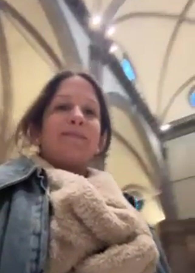 A woman holds the camera, filming a first-person perspective video inside a large, ornate building, likely a cathedral or church, identifiable by its high, arched ceilings and stained glass windows