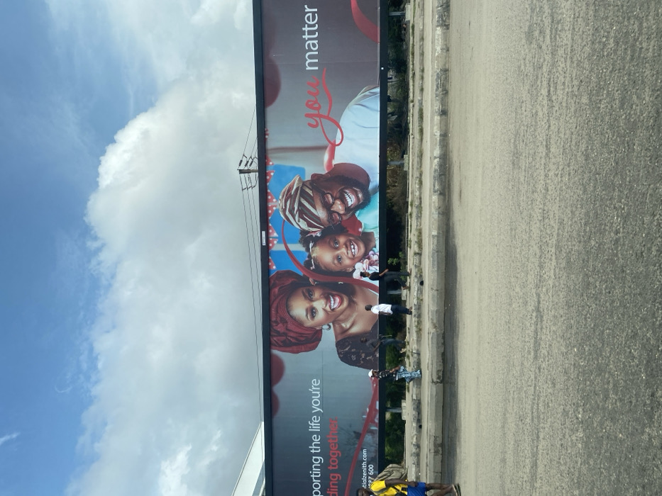 This image captures an urban street scene in Ikate, Nigeria, under a partly cloudy sky. A large horizontal billboard, prominently situated above an elevated concrete median strip, dominates the midground. The billboard displays an advertisement for Zenith Bank, featuring a smiling woman in a dark red gele, a young girl, and a smiling man in a striped cap. Text on the billboard reads "Supporting the life you're building together" and "you matter," with "tialzenith.com" also visible on the lower left. Below the billboard, on the concrete median strip, four adult males are present. Two are observed standing near each other, seemingly in conversation. A third man stands further right, facing towards the right side of the frame, and a fourth is partially obscured behind the first two. To the far left, a fifth male, wearing a bright yellow shirt, blue shorts, and a light-colored backpack, is partially visible walking on the paved road surface. The road in the foreground is wide, grey asphalt, appearing worn and dusty. Above the billboard, multiple dark utility lines run horizontally across the sky. A grey building with a darker roofline is partially visible behind the billboard on the left.