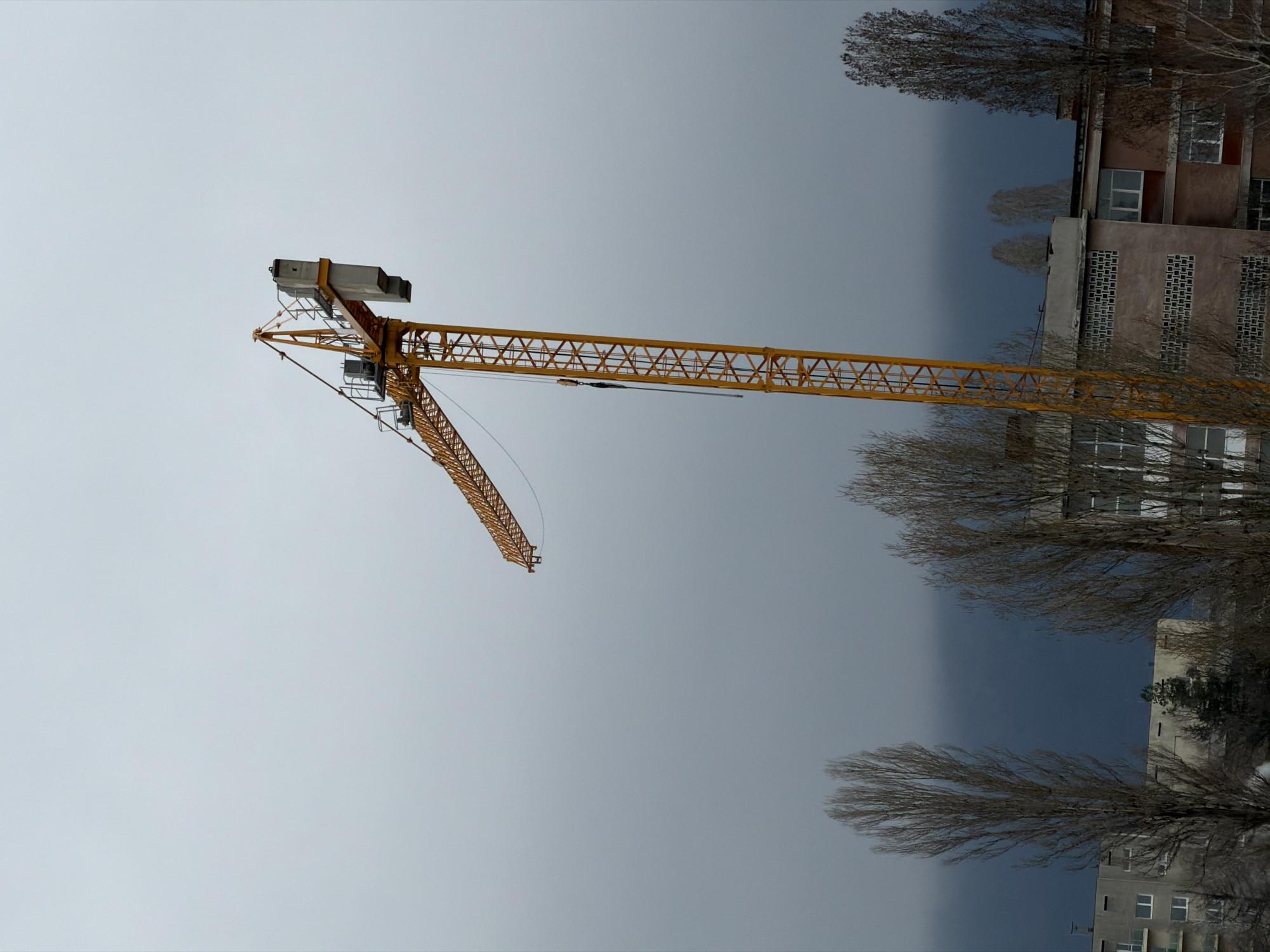 A construction crane dominates the scene, set against a backdrop of a cloudy sky that transitions from a light grey to a dark, ominous shade. The crane is a yellow lattice structure, with its long boom extending towards the left. To the right of the crane, there is a multi-story building, possibly residential, with bare trees obscuring parts of its facade. The building has a mix of red and grey sections, with regularly spaced windows. The trees are leafless, suggesting it is either winter or early spring. Without further details or context to the surrounding infrastructure, landmarks, or street signs it is difficult to definitively conclude that the scene is in Sofia, Bulgaria.