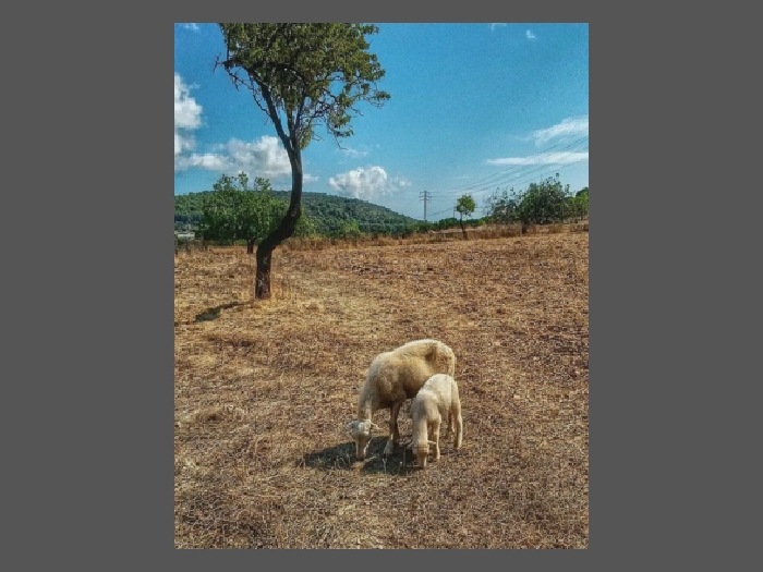 The image displays an outdoor, rural landscape under a clear blue sky with scattered white clouds