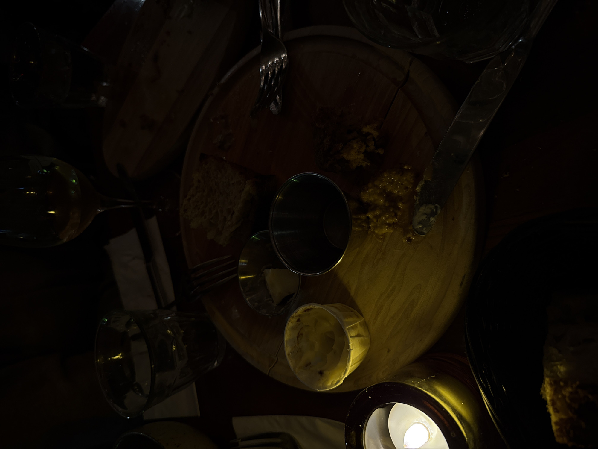 This image captures a dimly lit dining table scene in Montreal, Canada