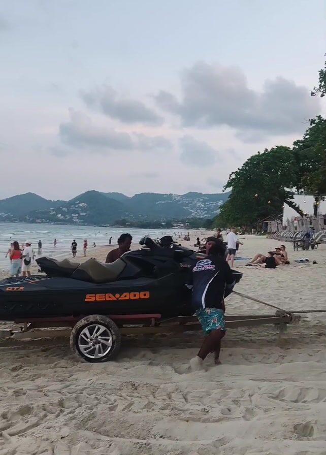 several people on a sandy beach beside the ocean on an overcast day. Mountains can be seen in the background. The main focus of the scene is a black Sea-Doo jet ski on a small trailer on the beach. Two men are standing near the jet ski, one of whom is holding a rope attached to the trailer. Further down the beach, a row of three other jet skis on trailers are parked, with their front ends facing the ocean. People are scattered along the beach, some standing near the water, some swimming, and some relaxing on the sand. There are also some trees and structures that could be beach huts or umbrellas.