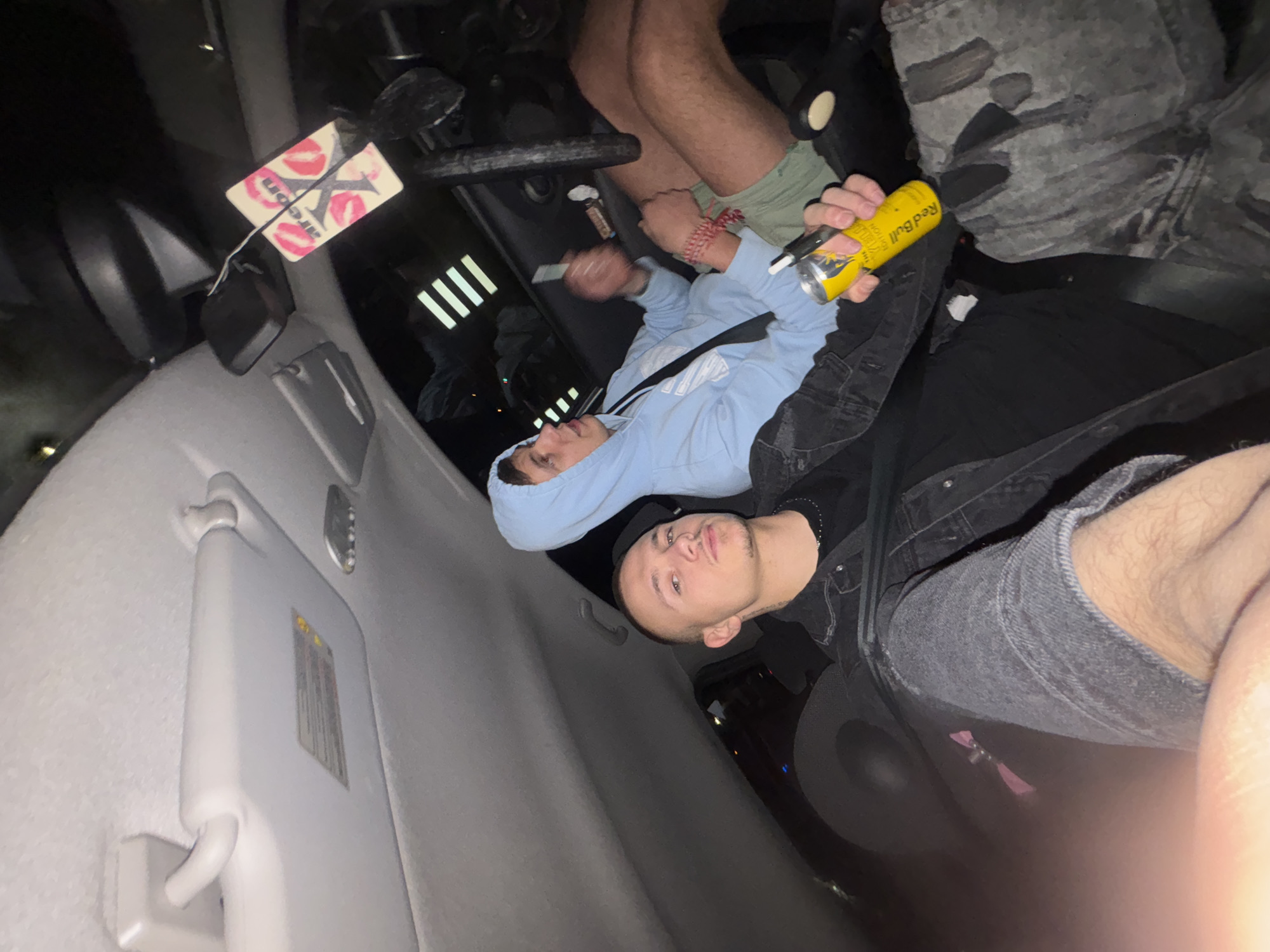 The image depicts the interior of a vehicle at night, specifically focusing on two young adult males