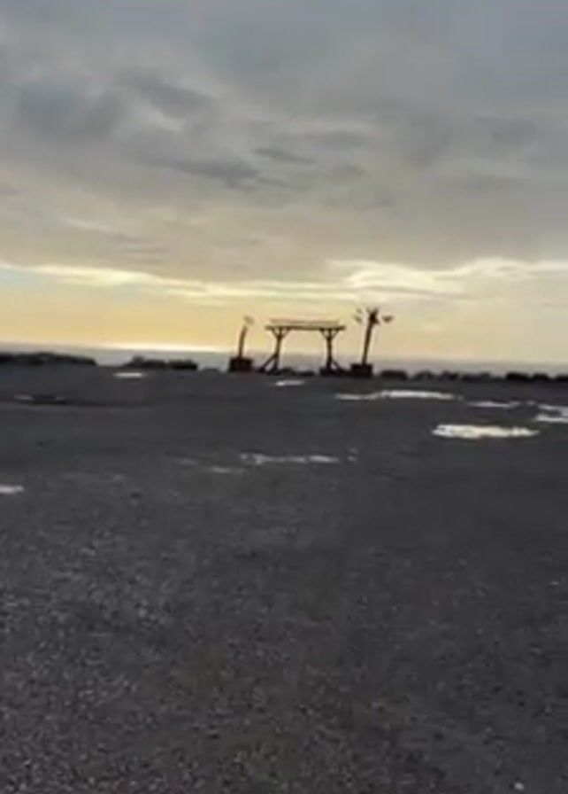 static, wide shot of a gravel parking lot with puddles, facing an ocean under a cloudy sky. In the center of the frame, near the edge of the parking lot, stands a wooden structure resembling a swing set, flanked by two artificial palm trees. The horizon line of the ocean is visible behind the structure, with a bright glow suggesting the sun is setting or rising. The overall scene appears deserted and quiet.
