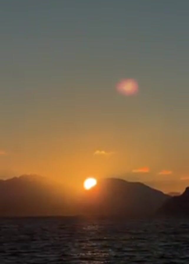The sun is setting behind the silhouette of a mountainous landmass. The water in the foreground is dark and rippled, reflecting the light of the setting sun. The sky is a gradient of colors, from blue at the top to orange and yellow near the horizon. There is a lens flare in the upper-right corner of the frame. The overall scene conveys a sense of tranquility and natural beauty.
