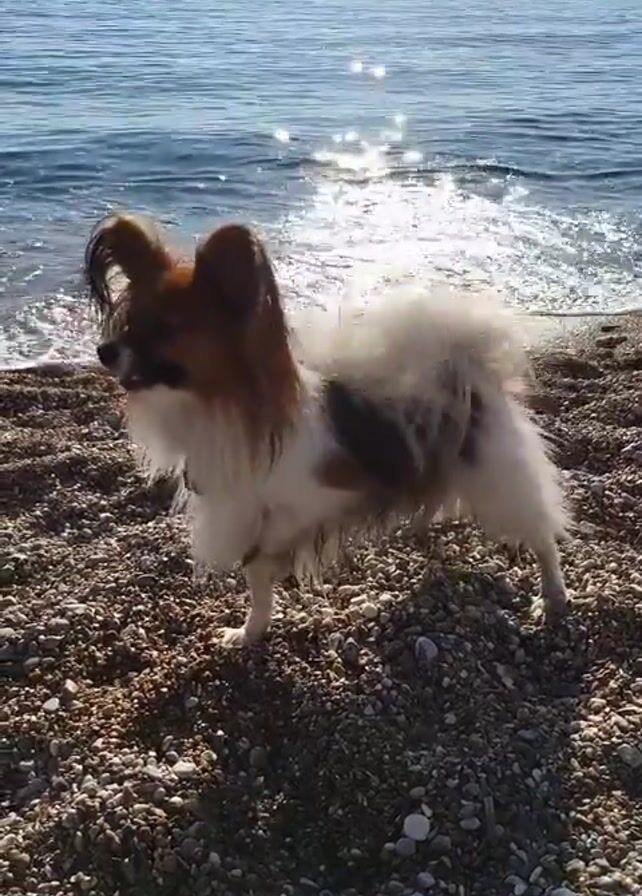 small dog on a pebble beach next to a body of water, presumably the ocean. The dog is a Papillon breed, with a white and brown coat and distinctive butterfly-like ears. The dog is standing initially, then shakes its body, and then walks toward the water. The beach is covered in small, round pebbles. The water is calm with small waves, reflecting the sunlight, creating a sparkling effect. The sky is blue with a few white clouds. The overall scene suggests a bright, sunny day at the beach.