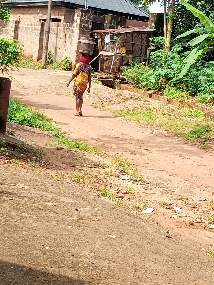 The image depicts an unpaved, reddish-brown dirt road in Oko Town, Nigeria, under natural daylight. A female individual, seen from behind, walks away from the viewer, moving towards the upper center of the frame. She wears a yellow and dark-patterned short-sleeved dress, flip-flops, and carries two dark-colored cylindrical containers stacked on her head, with a reddish fabric visible beneath the load. To the left of the road, a light-brown cinder block building with a dark corrugated metal roof is partially visible, featuring a utility pole nearby. To the right, a small, rustic wooden kiosk or stall with a corrugated metal roof is situated next to a concrete-lined drainage ditch or culvert. The kiosk contains visible items, suggesting merchandise. Lush green vegetation, including large leafy plants and smaller shrubs, borders both sides of the road and surrounds the structures. Scattered pieces of light and dark debris are visible on the road surface.