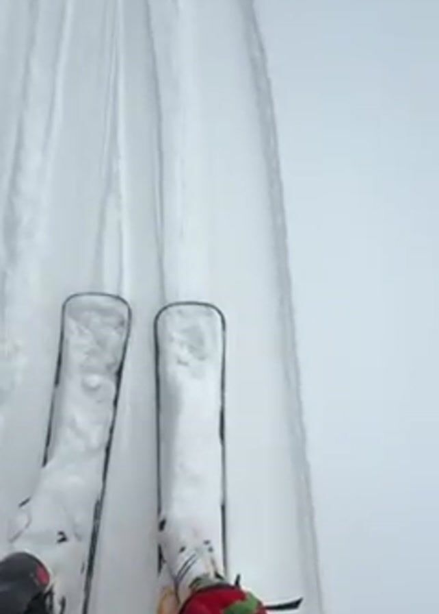 A first-person point-of-view video shows a person skiing downhill on a snow-covered slope on a foggy day