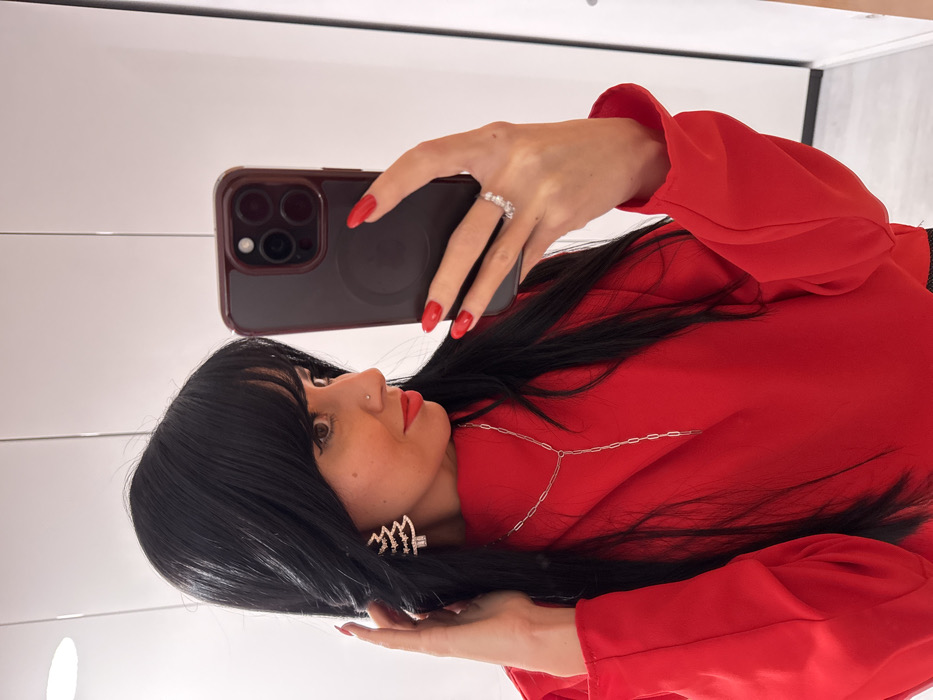 A female individual is depicted from the chest up, taking a mirror selfie in an indoor setting. She has long, dark hair with bangs and wears a bright red long-sleeved top. Her visible left ear features a silver-toned, Christmas tree-shaped earring with white embellishments. A silver-toned Y-chain necklace with paperclip links is visible around her neck. Her lips are covered in red lipstick, and a small silver piercing is present on her left nostril. Her right hand, adorned with red nail polish and a multi-stone silver-toned ring on the ring finger, holds a dark-colored smartphone with a prominent triple-lens camera array, aimed at the mirror. Her left hand is raised, with fingers touching the hair near her left ear. The background consists of plain, light-colored vertical panels, possibly reflective, and an overhead light fixture is visible reflected in the upper left. The specific location within Nuremberg, Germany, is not discernible from the image.