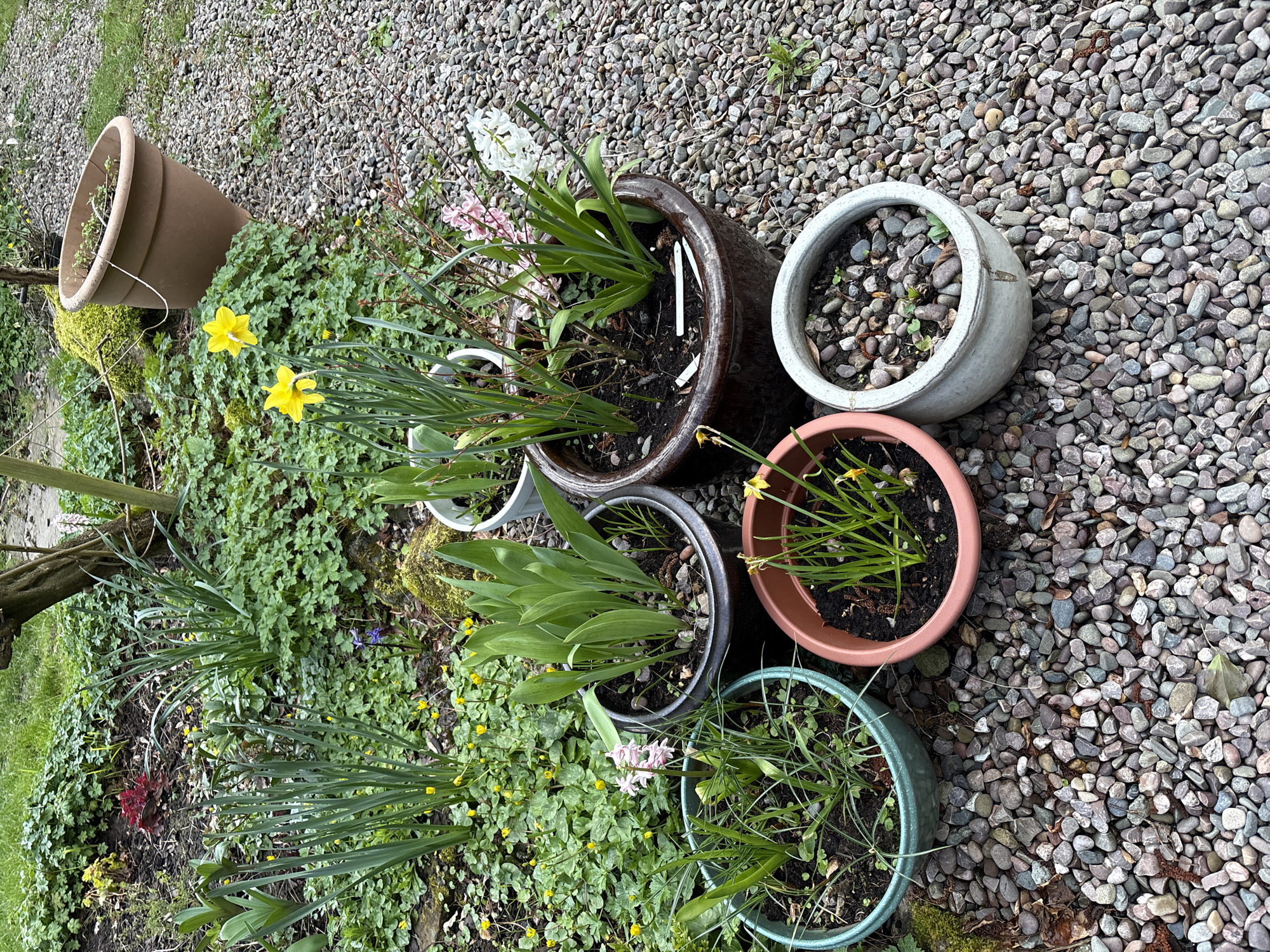 The scene depicts a garden in Pulverbatch, United Kingdom. Several potted plants of various sizes and colors are arranged on a gravel surface. Some pots contain daffodils in bloom, while others show various stages of growth. One large brown pot lies on its side amidst patches of green ground cover. The background consists of gravel and some vegetation. No people are visible.