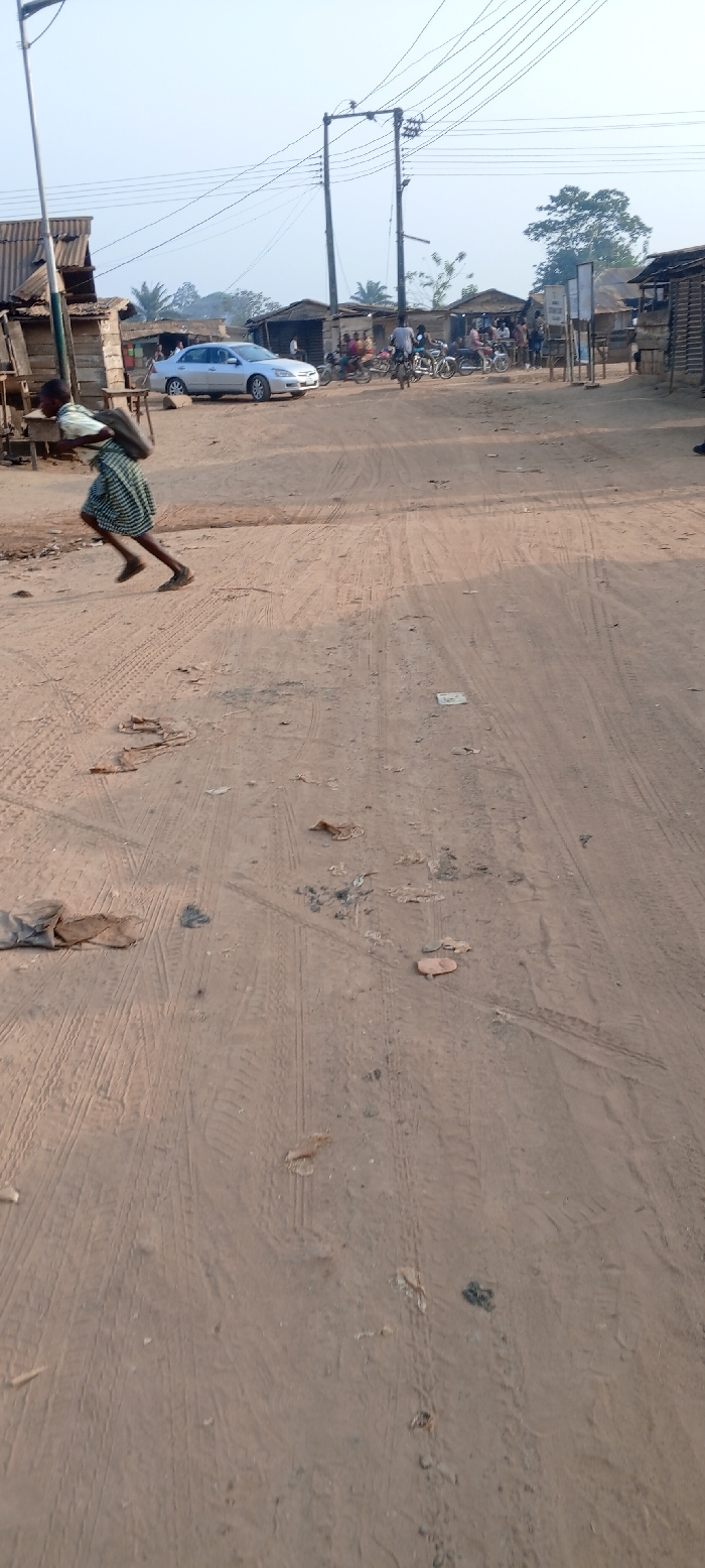 A sandy road dominates the foreground, marked with tire tracks and scattered debris. A person hurries across the road carrying a load on their head. In the background, a silver car is parked beside weathered shacks with corrugated roofs. People and motorcycles gather near the shacks. Power lines stretch across the sky above. The scene depicts a rural or impoverished setting with basic infrastructure.