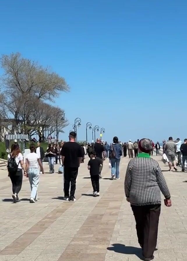sunny day on a promenade. The sky is clear blue. A crowd of people is walking along a stone-paved walkway. There are lamp posts lining the walkway. To the left, there are trees and bushes. In the background, the sea can be seen in the distance. People of varying ages are walking in different directions. A woman in a patterned sweater and brown pants is walking away from the camera.