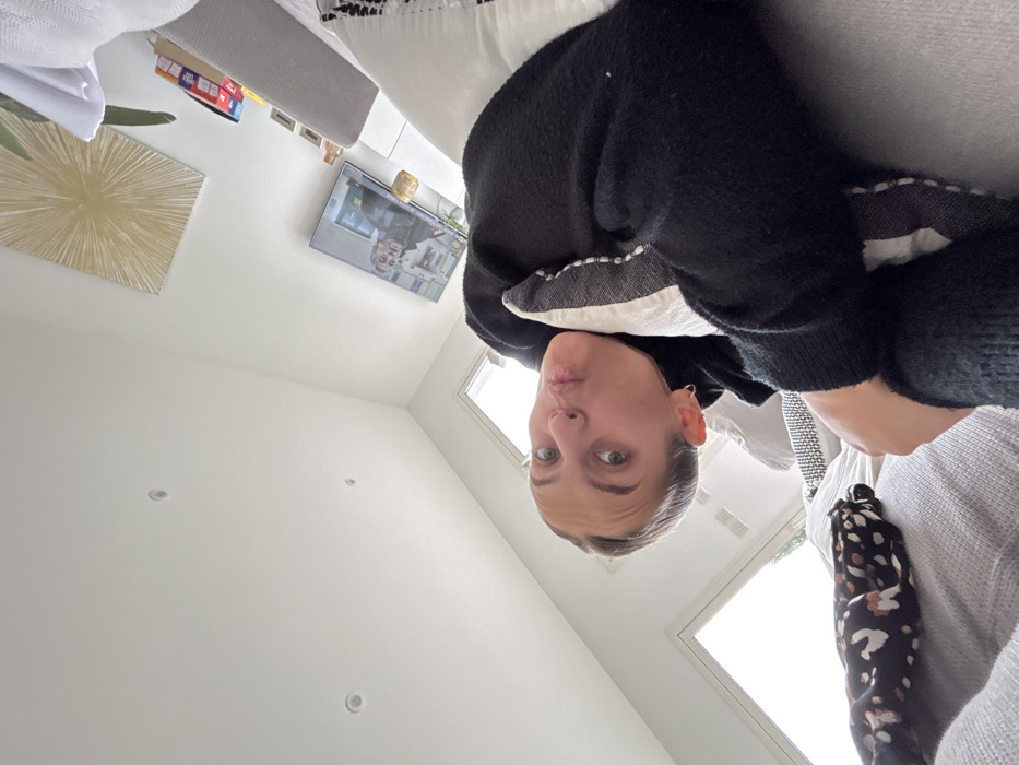 This image depicts an indoor scene within a residence in Veauchette, France. A young adult female with light-colored hair, styled pulled back with a lighter front streak, is positioned in the foreground, reclining on a light-colored sofa or bed. She wears a dark, long-sleeved top and small hoop earrings. Her lips are pursed, and her eyes are open, directed towards the camera. She holds a white and dark-striped cushion against her torso with both hands. A dark, patterned fabric item rests on the sofa to her immediate left. The room features white walls and a sloped white ceiling with three recessed light fixtures. A large window on the left side provides bright natural light, with faint green foliage visible outside. In the background, a flat-screen television is mounted on the wall, displaying an image of two individuals. Below the television, a white credenza supports a small decorative object. Above the television, a gold-toned, radial art piece adorns the wall. A light grey sofa section with additional cushions, colorful items, and a white textured throw is visible in the upper right portion of the scene. The environment is brightly illuminated.