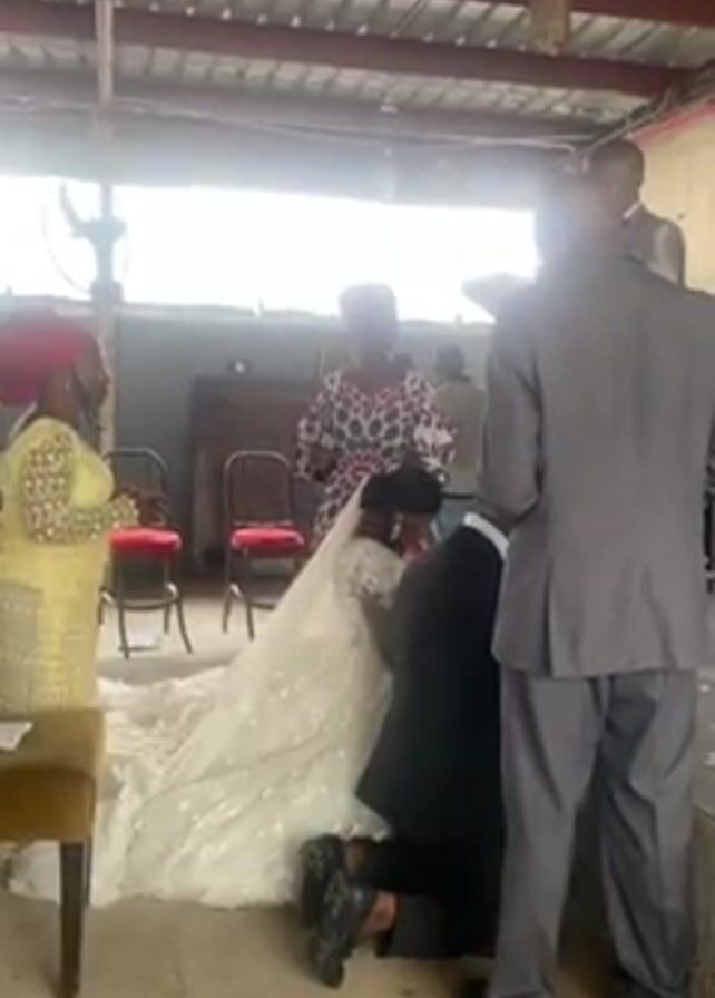 wedding ceremony in an indoor venue with a corrugated metal roof. A bride in a white gown kneels on the concrete floor in front of a groom, who is also kneeling. Three women stand behind the bride and groom, observing. A man in a gray suit stands with his back to the camera, also observing the couple. There are several red chairs in the background, and a small table with a piece of paper on it in the foreground. A fan is visible on the left side of the frame.