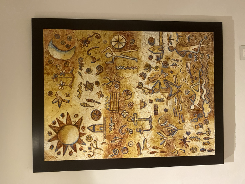 The artwork features a brown and gold textured background adorned with various symbolic motifs. Prominent symbols include a sun with rays, a crescent moon, stick figures in different poses, flowers, and geometric shapes. The figures and symbols are outlined with darker brown and hints of blue. The composition resembles ancient cave paintings or petroglyphs. The painting is encased in a thick, dark brown frame and mounted on a light-colored wall.