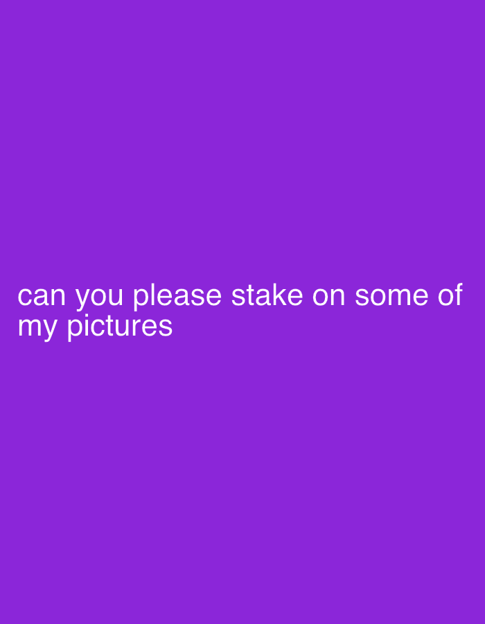 A purple background displays the request "can you please stake on some of my pictures" in white text