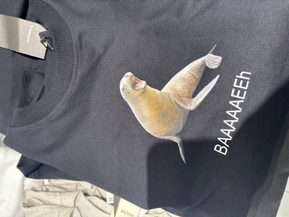 A black t-shirt, folded, is displayed. The t-shirt features a graphic of a brown sea lion with its mouth open, positioned above the white text "BAAAAAEEh". A black tag with white text "To feel good" is visible, hanging from the ribbed collar of the shirt. In the blurred background to the left, other light-colored, folded garments are visible, one with a partially discernible "House" brand tag. No individuals are present. The specific location within the city of Plovdiv, Bulgaria, cannot be determined from the provided image.