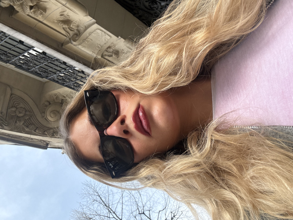 A low-angle, close-up outdoor image features a young adult female centrally positioned, looking directly into the camera. She has long, wavy blonde hair, wears dark Ray-Ban Wayfarer 'P' sunglasses, and dark red lipstick. A small nose piercing is visible on her right nostril. She is dressed in a light pink top, partially covered by a grey zipped garment. The background consists of two distinct sections. To the left, against a cloudy, light blue sky, are bare tree branches. To the right, a multi-story building facade constructed of light-colored stone is visible, featuring ornate architectural carvings and a dark wrought-iron balcony railing. This architectural style, characterized by its detailed stone embellishments and ironwork, is indicative of a Haussmannian building commonly found in Paris, France.