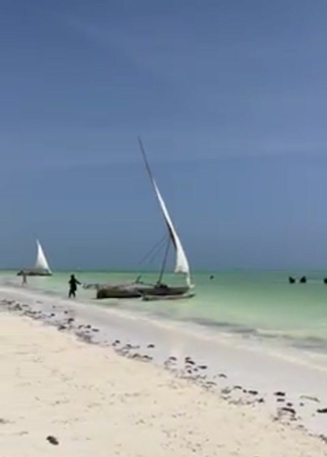 white sand beach with calm, shallow, turquoise water, under a partly cloudy sky. Several people are walking along the beach in the distance. Two small, traditional wooden sailboats, each with a single triangular sail, are beached near the water's edge. A person is standing near one of the boats. There is some seaweed debris scattered along the shoreline.