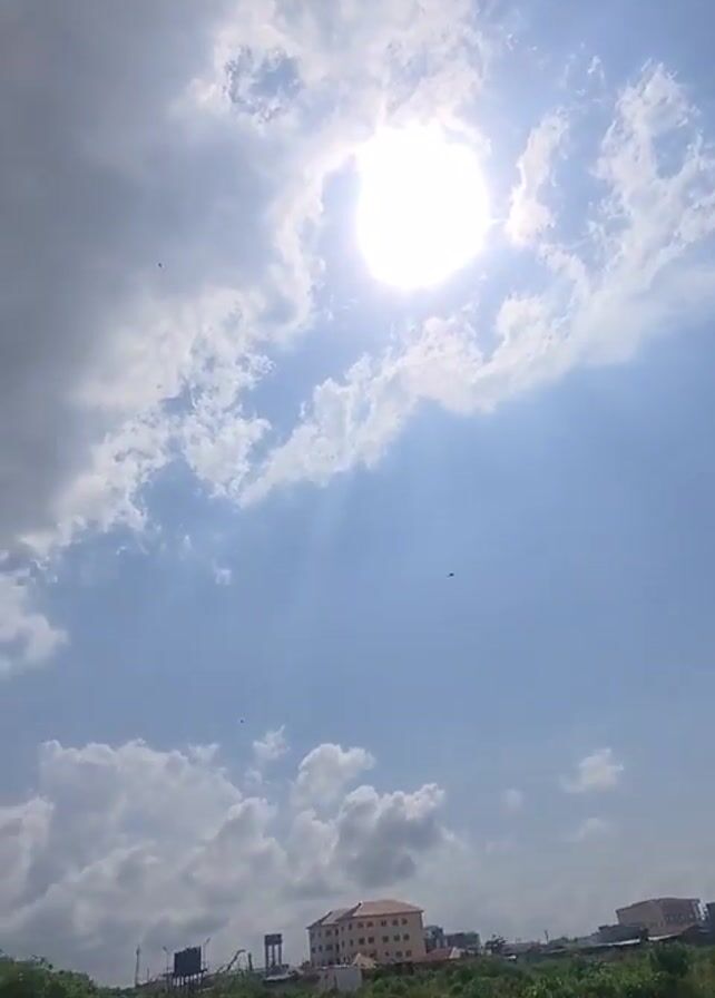 view of the sky with the sun shining brightly behind clouds, taken from a low angle on the ground. The sun is a bright circle, with rays of light filtering through the clouds. There are puffy white clouds scattered across the blue sky, with some darker, denser clouds as well. In the foreground, there is a grassy field with some vegetation. Beyond the field are some buildings, including a larger building with a light-colored facade and a few smaller structures. The scene appears to be outdoors on a sunny day.