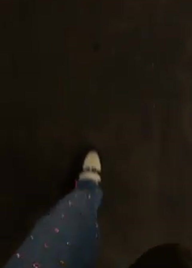 A first-person perspective shot shows a person walking on a dark surface, possibly a sidewalk or pavement. The person is wearing blue jeans with multicolored floral or star-shaped embellishments, and white sneakers. The lighting is dim, obscuring details of the environment. The camera is slightly shaky due to the motion of walking.