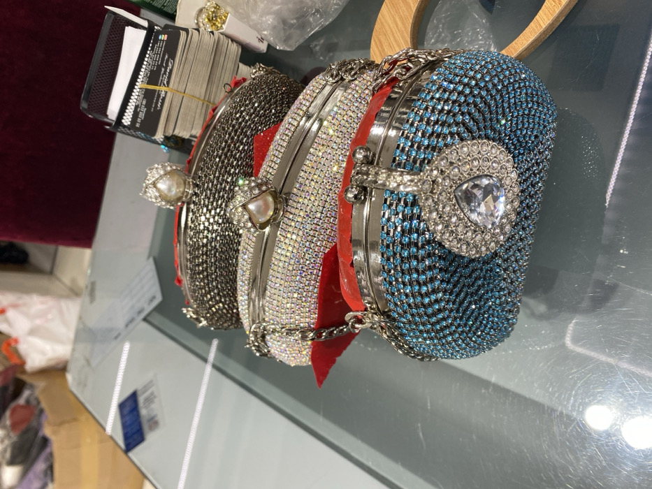 - "Three jeweled clutch purses are arranged sequentially on a reflective glass tabletop in what appears to be a retail or wholesale establishment in Istanbul, Turkey" by FM-QKjH13, licensed under CC BY 4.0