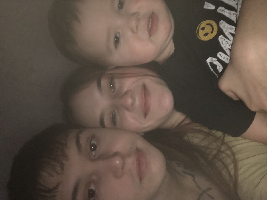 This is a low-light, close-up portrait featuring three individuals: an adult male, an adult female, and a young child, situated in the city of Фоки, Russia. The adult male, positioned on the left, has short dark hair, a light complexion, and a neutral facial expression, looking directly at the camera. A dark-colored tattoo, resembling a stylized 'X' or cross, is visible on the left side of his neck/upper chest. He is wearing a light-colored, possibly pale yellow or green, garment. The adult female, positioned in the center, has long dark hair, a light complexion, and is smiling subtly while looking towards the camera. She is wearing a light-colored garment, similar in hue to the male's. The young child, a toddler, is positioned on the right, held in place by an adult hand (likely the female's) wrapped around their torso. The child has light-brown hair, a light complexion, and a neutral to slightly pensive expression, also looking towards the camera. The child is wearing a black t-shirt featuring a prominent yellow smiley face graphic with partial white text, "Smiley," visible beneath it. The subjects are in close proximity, suggesting an intimate group interaction, possibly a family. The background is dark and indistinct, providing no discernible environmental details beyond a uniformly dark surface, suggesting an indoor setting with minimal illumination or a very shallow depth of field.