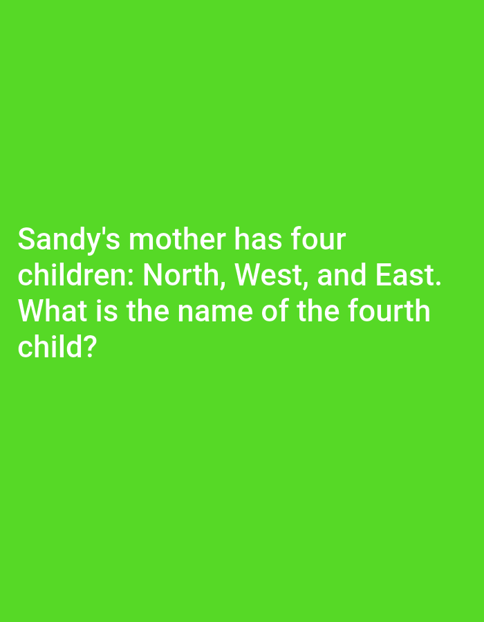 The image displays a riddle in white text against a lime green background. The riddle states, "Sandy's mother has four children: North, West, and East. What is the name of the fourth child?" This is a play on words riddle where the answer is "Sandy," as the question refers to Sandy's mother.