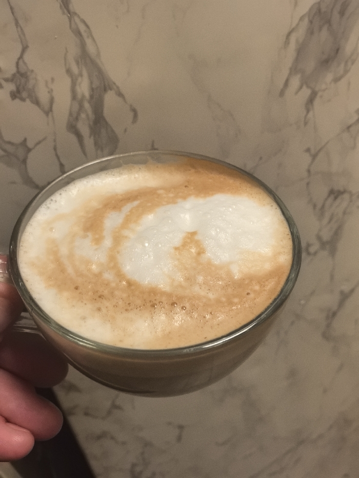 - "A clear glass mug containing a layered beverage, consistent with a latte or cappuccino, is centrally positioned and held by a human hand visible on the lower left" by FM-M77B43, licensed under CC BY 4.0
