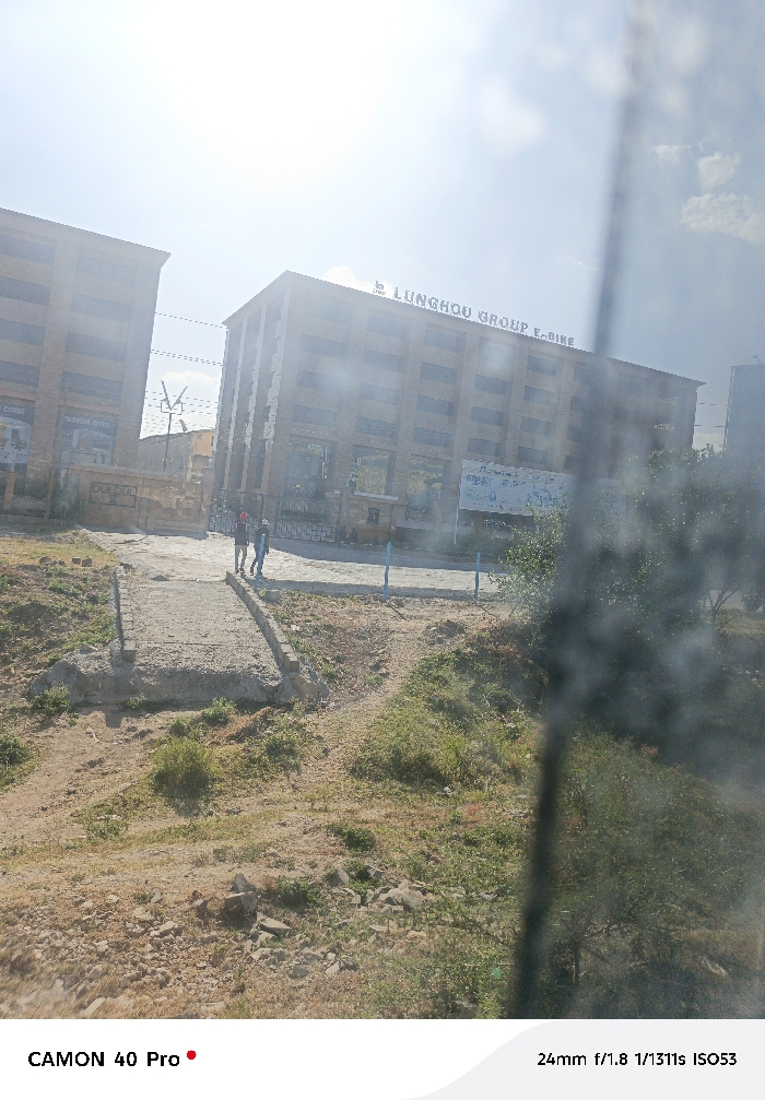A sunlit view depicts two large, brick buildings with the signage "LUNGHOU GROUP E-BIKE" atop one. A stone walkway leads towards the buildings, where two figures are walking. The foreground shows a dry, grassy patch. The right side of the image is obscured by a blurred, leafy object, possibly a tree branch or foliage, giving the impression of looking through a window or foliage. The overall scene appears bright due to the strong sunlight.