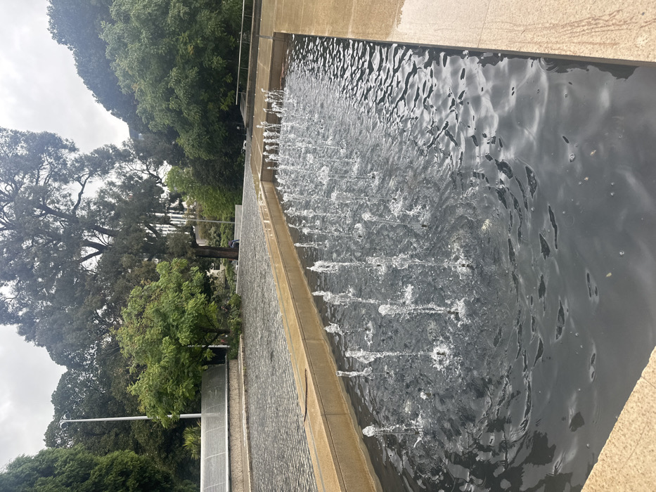 The image depicts an outdoor public space in Carlton, Australia, under an overcast sky. In the foreground and mid-ground, a rectangular, shallow fountain system is active, featuring multiple vertical water jets evenly spaced across a dark water surface, creating ripples. The fountain is contained within light-colored stone borders. To the left of the fountain, a dark, textured paved area extends backward. A thin, dark linear object, possibly a hose or cable, lies on this pavement near the fountain's edge. In the mid-ground and background, dense green foliage and trees dominate, with a particularly large tree visible toward the center-left. A tall, slender white pole is positioned on the left side of the frame, emerging from the trees. One individual is seated on a low structure in the far background, partially obscured by trees, appearing to wear dark clothing. No specific actions or interactions are discernible for this individual.