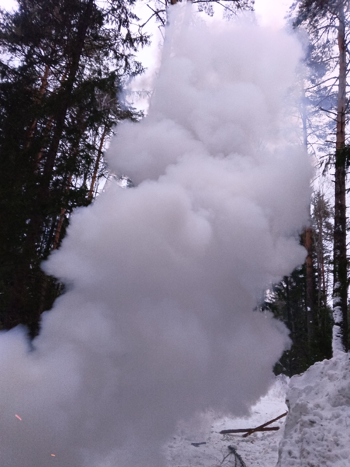 - "A large, dense plume of light gray to white smoke rises vertically, dominating the central and right portions of a snowy, forested outdoor scene" by FM-ln5U43, licensed under CC BY 4.0