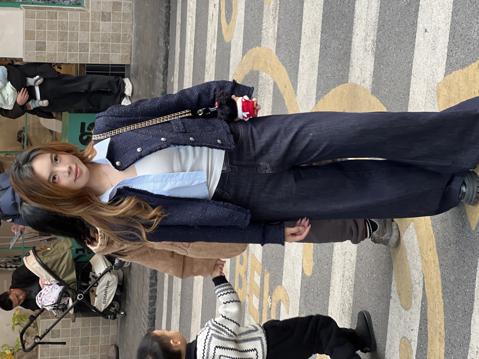 This image depicts a street scene in a city in Liangjiang, China. The primary subject is a young East Asian adult female standing upright, slightly angled to the left, with a subtle smile. She has long, light brown hair. Her attire includes a cropped light blue collared shirt layered over a white tank top, a navy blue tweed-style cropped jacket with prominent gold-toned buttons, dark blue wide-leg jeans, and black chunky-soled shoes. A black shoulder bag with a gold chain strap is visible, from which a small black and red plush object hangs. Behind her, partially obscured, stands another individual in a brown jacket. To the left, a young East Asian boy, approximately 4-6 years old, holds the hand of the obscured individual. The boy wears a white sweater with a black geometric pattern, dark pants, and dark footwear. In the background, a man pushes a black stroller containing a white bag marked "ELEGANTBABY". Further right, another person carries an infant. The environment features building facades with visible tiling and a storefront entrance. The street pavement displays yellow and white pedestrian crossing markings.