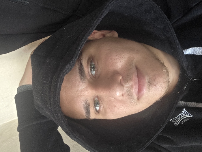 The image displays a close-up, vertical portrait of a male individual. He has light-colored eyes and short facial hair, including a mustache and stubble on his chin and jawline. The individual is wearing a black hooded sweatshirt with the hood pulled over his head, framing his face. A partial white logo, identified as "Lonsdale London," is visible on the lower left chest area of the sweatshirt. A black zipper and a white drawstring are present on the front of the garment. The individual is looking directly forward, towards the camera, with a neutral expression. The background is out of focus, showing light-toned, unidentifiable surfaces, suggesting an indoor environment. The specific location within the city of Brusen, Bulgaria, cannot be determined from the visual information contained in the image.