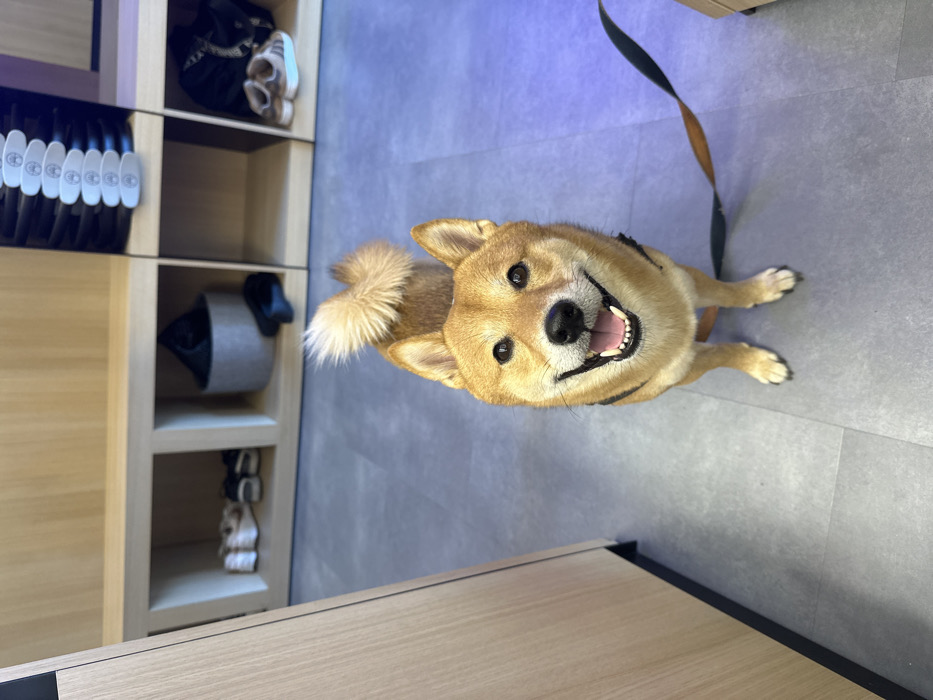 - "An indoor photograph captures a Shiba Inu dog standing on a grey tiled floor, looking directly at the camera with an open-mouthed expression revealing its teeth and a partial view of its tongue" by FM-6GjX42, licensed under CC BY 4.0