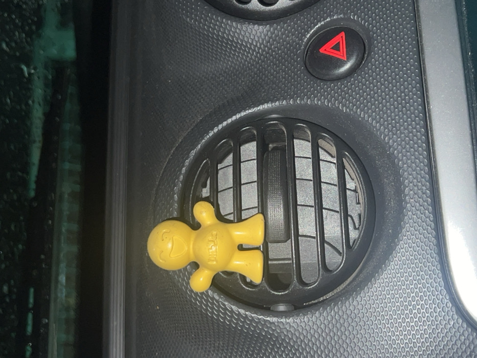 The image displays the interior of a vehicle, specifically focusing on a portion of the dashboard. A yellow, humanoid-shaped air freshener with a smiling face is positioned upright on the horizontal slats of a circular air conditioning vent. The air freshener has illegible text on its chest. The dashboard surface is dark grey with a fine, textured, pebbled pattern. To the immediate right of the air vent, a black circular button with an illuminated red triangular hazard symbol is visible. Below the dashboard section, a lighter grey trim piece runs horizontally. Above the dashboard, a portion of the vehicle's windshield is visible, covered in numerous water droplets, suggesting rain or condensation. The exterior view through the windshield is dark and indistinct, offering no discernible details of the environment outside. There are no people visible. The location in Kribul, Bulgaria, is not discernible from the provided image.