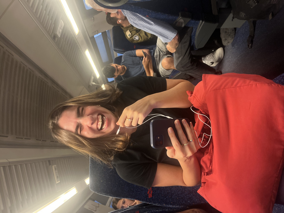 The scene is set inside an Israel Railways passenger train, consistent with services operating to and from cities like Netanya, Israel. In the immediate foreground, a young adult female with shoulder-length brown hair is shown mid-laugh, her mouth wide open, exposing her teeth, which include what appears to be braces or aligners on the lower arch. She wears a black short-sleeved top and two rings on her left hand. Her left hand holds a dark blue smartphone (identifiable as an Apple iPhone), while her right hand holds a white wired earphone, the cable trailing from the phone. A bright red, fabric-like bag or garment is draped across her lap. Behind her to the left, another female's face is partially visible. To the right, further back, a young adult male with dark hair, wearing a blue t-shirt and grey shorts, is seated and looking down at a smartphone. Behind him, a male individual is wearing a khaki-colored uniform shirt consistent with an Israel Defense Forces (IDF) uniform, including a visible shoulder patch. He has a white earpiece in his right ear. To the far right, partially visible, an older male in a blue checkered shirt, grey trousers, and white sneakers (Nike brand visible) is seated. A black bag rests on the blue-carpeted floor near his feet. The train interior features blue upholstered seats with subtle red accents, a white ribbed ceiling with rectangular fluorescent lighting fixtures, and large windows revealing a bright, possibly overcast, exterior.